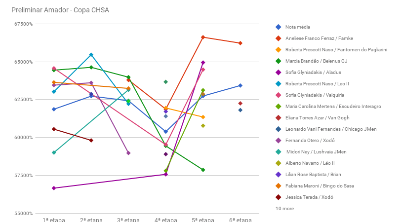 Faltando apenas uma etapa para terminar a temporada da Copa CHSA de Adestramento, é possível ter uma ideia de como os conjuntos evoluíram (ou não) durante a temporada 2017. O site Adestramento Brasil atualiza os gráficos que mostram a disputa das séries e a flutuação das notas finais dos participantes.