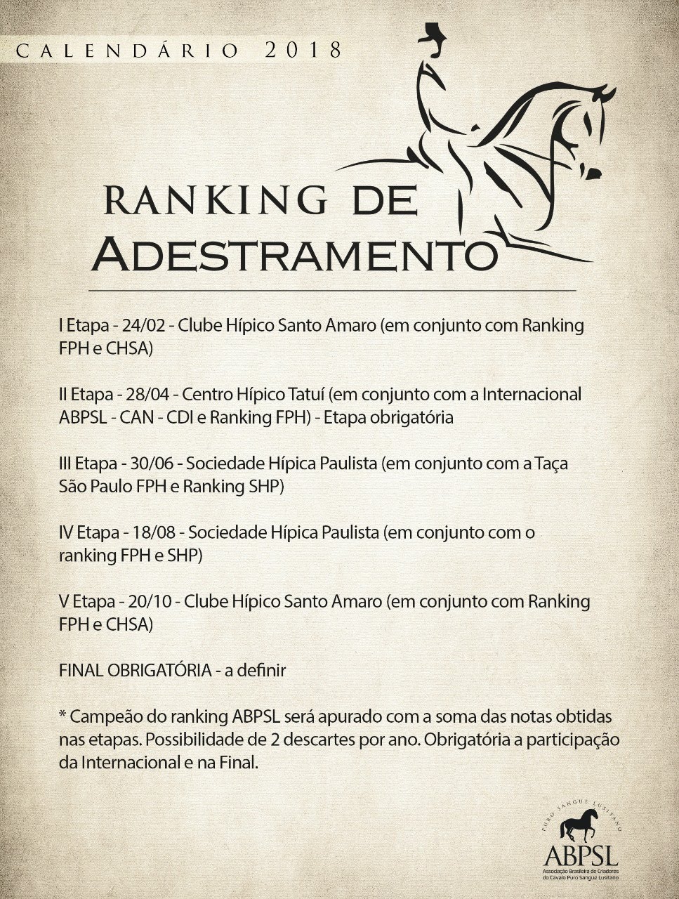 A temporada de provas de 2018 em São Paulo começa em fevereiro. Tanto as hípicas como a Associação Brasileira de Criadores do Cavalo Puro Sangue Lusitano (ABPSL) contam com rankings internos que, ao fim das etapas, consagram os melhores conjuntos do ano, premiando, normalmente, campeão e vice.