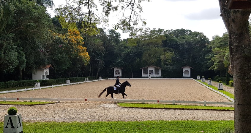 Vamos por partes e começar pelo mais básico. As provas de adestramento são realizadas em picadeiro que mede 60 metros de comprimento por 20 metros de largura e existem letras em lugares determinados (veja na ilustração). Estas letras vão “guiar” os movimentos a serem executados em cada teste.