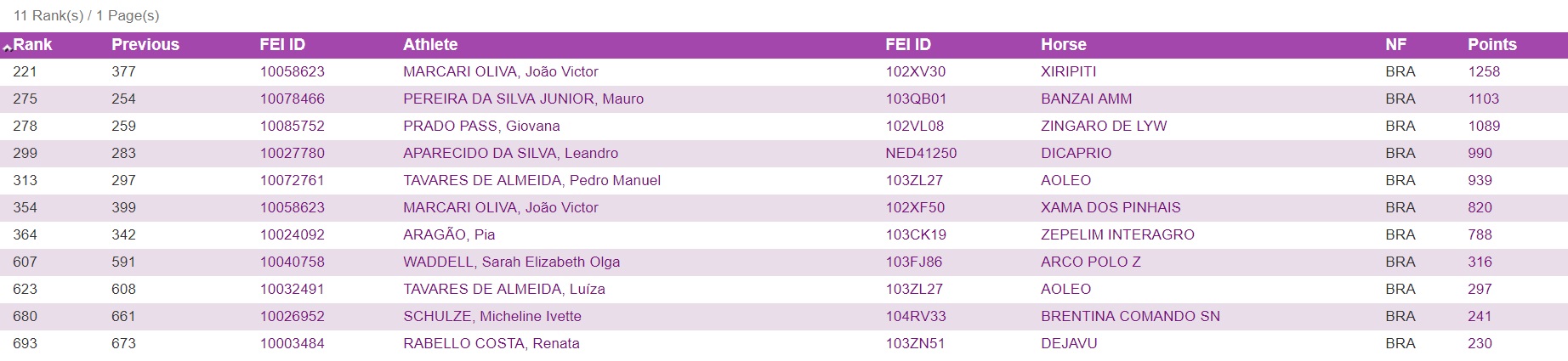João Victor Oliva subiu da 377ª para 221ª posição, com 1258 pontos, enquanto Mauro Pereira caiu da 254ª para 275ª colocação e 1103 pontos. O resultado de Oliva com Xiripiti refletem a temporada de treinos e competições internacionais em Portugal. O conjunto disputou uma série de CDIs, sendo o último o CDI 3* de Cascais, quando obteve o quarto índice para os Jogos Equestres Mundiais (WEG, na sigla em inglês).