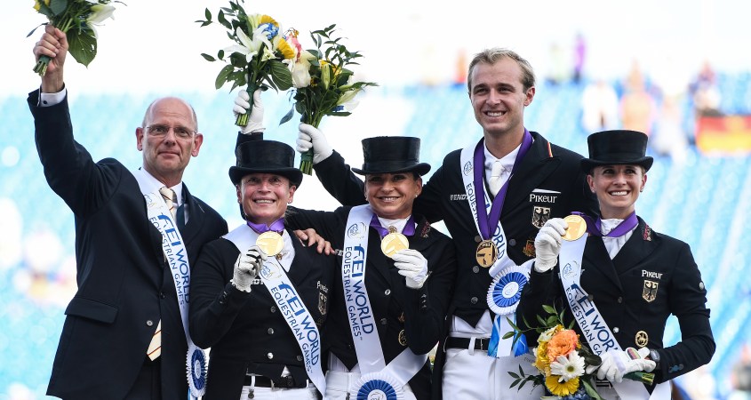 TRYON, EUA — A Alemanha seguiu o favoritismo e ganhou os Jogos Equestres Mundiais (WEG) por equipes. A maior disputa ficou para o segundo posto. Até o intervalo para almoço, quando três dos quatro representantes dos times já haviam entrado em pista, o Reino Unido estava na vice-liderança, com 151,864 pontos, seguido bem de perto pelos Estados Unidos, com 151,599%.
