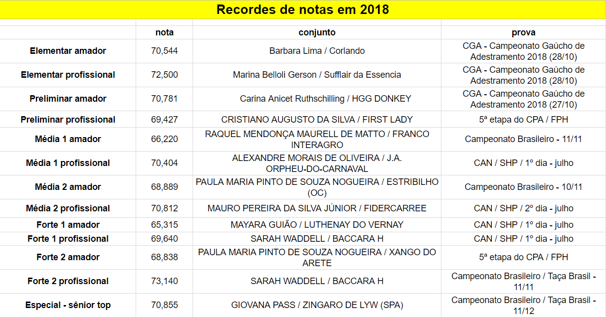 Na média 1 amador, Raquel Mendonça de Mattos e Franco fizeram 66,220 no dia 11/11 no CBA, tirando o recorde que era de Tania Maia Ferreira, que tinha feito 65,152% com Roma na 1ª etapa do ranking FHBr. Na média 2 amador, Paula Nogueira pontuou 68,889 com Estribilho no dia 10/11 no CBA, passando os 67,949 de Sophia Baptista de Oliveira e Darius 363.