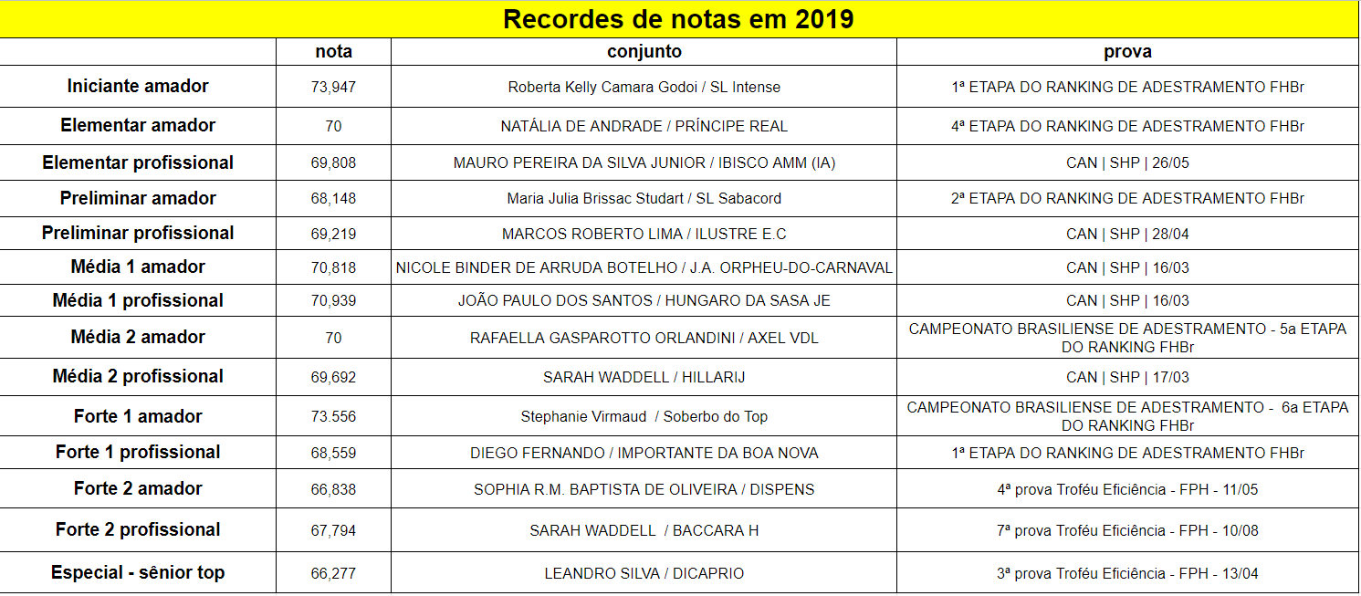 No ano passado, devido à disparidade das notas, Adestramento Brasil decidiu não incluir os resultados do Campeonato Paranaense de Adestramento 2018 nos Recordes do Ano. Com porcentuais finais acima dos 75% em diversas categorias e séries, as notas destoaram dos resultados alcançados pelos conjuntos em outras regiões do Brasil. Por exemplo, o conjunto que ganhou a elementar amador registrou 77,325%, o de preliminar amador fez 75,51% e o mirim, 72,332%. As notas foram ainda maiores nas categorias mais altas: na média 1 profissional foi de 77,205%, na média 2 profissional, 78,205%; na média 2 amador, 82,18%; na forte 1, 76,39% e na forte 2 (intermediária), 79,73%.