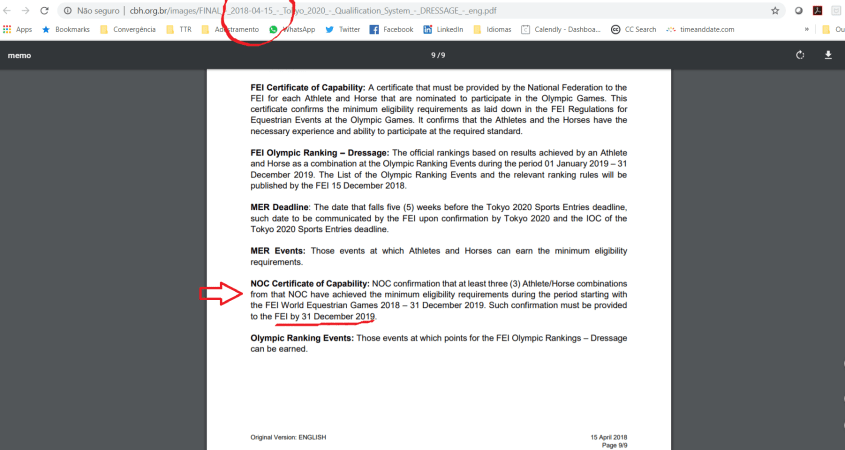 A Confederação Brasileira de Hipismo (CBH) publicou em seu site, em 15 de abril de 2018, documento oficial da Federação Equestre Internacional (FEI) acerca do processo de qualificação para os Jogos Olímpicos de Tóquio 2020, no qual consta a regra da necessidade de se apresentar o certificado de capacidade (“NOC Certificate of Capability”) até 31 de dezembro de 2019 para confirmar o lugar conquistado nos Jogos Pan-Americanos — o Brasil ganhou medalha de bronze por equipe em Lima 2019. O documento foi divulgado na página da entidade que reúne todos os regulamentos oficiais.