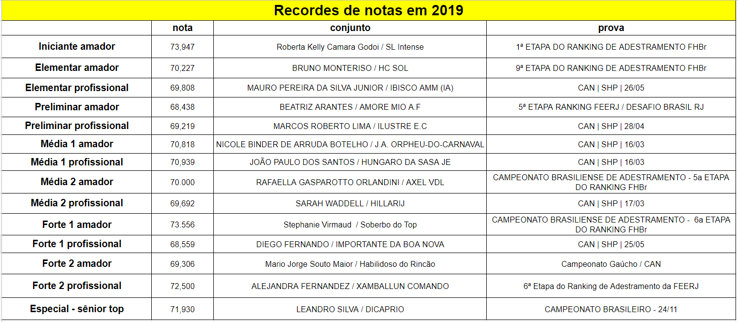 Encerrada a temporada 2019, Adestramento Brasil divulga o ranking com as notas mais altas obtidas pelos conjuntos em provas nacionais e estaduais. Foram consideradas todas as notas que constam dos resultados oficiais divulgados por federações e confederação. Recordes do Ano é uma iniciativa deste noticiário, que compila e compartilha os melhores resultados das provas oficiais.