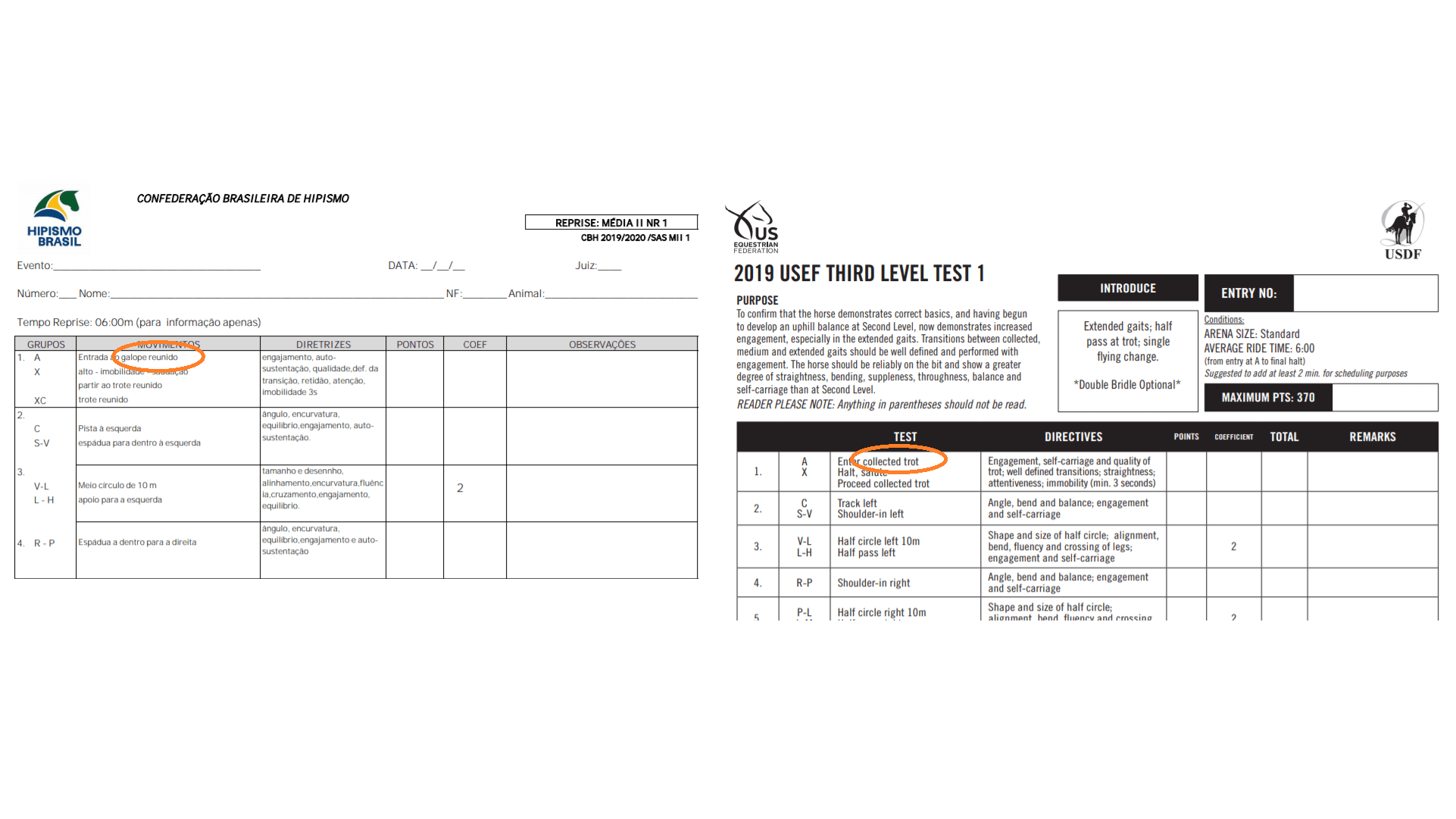 O Brasil, assim como diversos países das Américas, compra os direitos de uso dos testes emitidos pela Federação Equestre dos Estados Unidos (USEF). Em 2018, a USEF e a Federação de Adestramento dos EUA (USDF) divulgaram as versões válidas para o período de 2019 a 2022. Em fevereiro de 2019, a CBH informou que os novos testes entrariam em vigor em meados de 2019, mas depois anunciou que eles seriam adotados apenas na temporada de 2020.