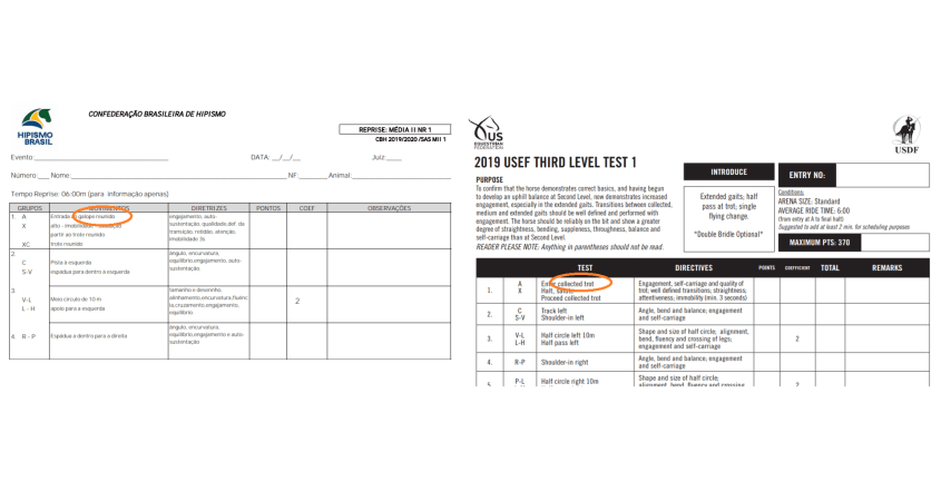 Na preliminar, a figura 4 não especifica o tamanho do círculo (20 metros, segundo o teste na versão original). Na elementar, enquanto na original após a saudação inicial em X pede-se que saia em trote de trabalho, na versão da CBH está passo médio.