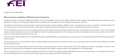 , e do FEI Sports Forum, a Federação Equestre Internacional emitiu, na última sexta-feira 13/03, uma nota recomendando o cancelamento de eventos da FEI devido ao coronavírus Covid-19. A entidade afirmou que a resolução foi tomada após o comunicado da Organização Mundial da Saúde (OMS) acerca de reuniões de massa e a necessidade dos organizadores de eventos realizarem uma avaliação completa dos riscos junto às autoridades locais.