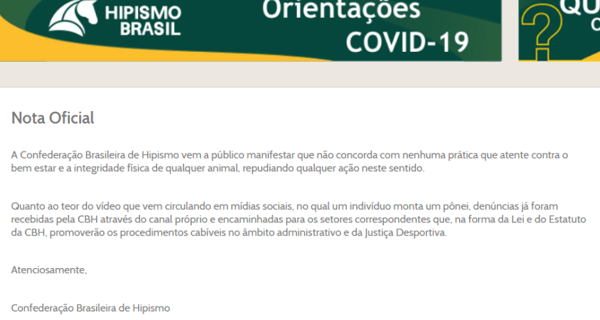 Em nota, a FPH afirmou estar ciente sobre as denúncias. “Reafirmamos que repudiamos quaisquer atos de maus tratos e atitudes de abuso com risco a integridade física ou emocional de qualquer animal. Diante do comunicado da CBH divulgado nesta data, informamos que estamos alinhados com o mesmo princípio de bem-estar e confiantes que os órgãos responsáveis caminhem com os procedimentos necessários no âmbito administrativo e desportivo”, diz a nota.