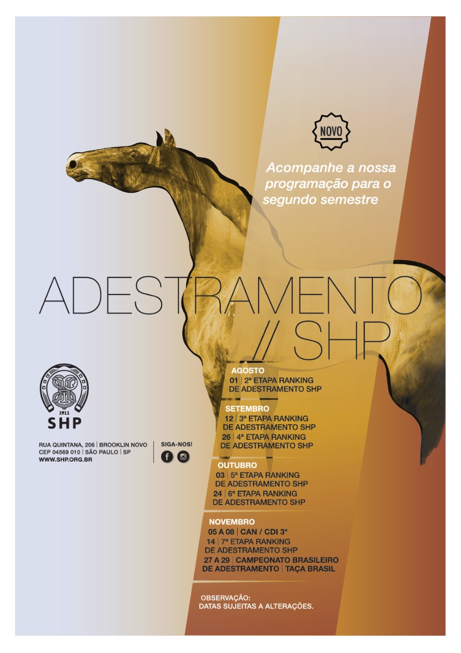 Desde março sem competições, em virtude da quarentena imposta para tentar conter a propagação da Covid-19, as provas de adestramento na SHP recomeçaram em 1º de agosto com 24 inscrições. Diferentemente da etapa anterior, em 12/9, não há indicação de limitação no número de inscritos, mas os participantes devem seguir as orientações da cartilha (confira aqui).