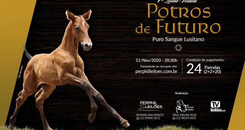 Potros e potras puro sangue lusitanos de um a três anos de idade de importantes criatórios brasileiros vão à leilão no próximo dia 11 de novembro. São 26 animais ofertados por Coudelaria Rocas do Vouga, Coudelaria Ilha Verde, Haras Crystal, Haras Carvalho, Coudelaria Amor e Cura, Coudelaria do Castanheiro, Haras Imperial, Coudelaria Aguilar, Haras São Francisco e Coudelaria Luso Brasileira, Haras Passárgada e Coudelaria do Nico.