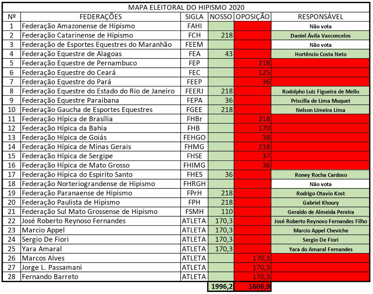 Dezoito federações constam como aptas a votar na eleição de 29/1. São elas: Federação Amazonense de Hipismo, Federação Equestre de Alagoas, Federação Equestre do Ceará, Federação Hípica de Brasília, Federação Hípica de Goiás, Federação Sul Mato-grossense de Hipismo, Federação Hípica de Minas Gerais, Federação Equestre do Pará, Federação Equestre Paraibana, Federação Paranaense de Hipismo, Federação Gaúcha de Esportes Equestres, Federação Catarinense de Hipismo, Federação Hípica da Bahia, Federação Hípica do Espírito Santo, Federação Hípica do Mato Grosso, Federação Equestre de Pernambuco, Federação Equestre do Rio de Janeiro e Federação Hípica de Sergipe.