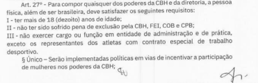 Diz o estatuto que, para compor quaisquer dos poderes da CBH e da diretoria, a pessoa física tem de ser brasileira, ter mais de 18 anos de idade, não ter sofrido pena de exclusão pela CBH, FEI, COB e CPB e não exercer cargo ou função em entidade de administração e de prática, exceto os representantes dos atletas com contrato especial de trabalho desportivo.