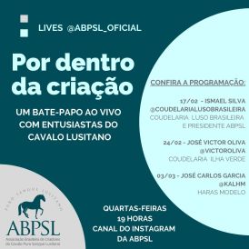 A Associação Brasileira de Criadores do Cavalo Puro Sangue Lusitano (ABPSL) começou na quarta-feira passada (17/02) uma série de bate-papo ao vivo no Instagram, as famosas lives, com entusiastas da raça. As entrevistas, conduzidas pela editora do Adestramento Brasil, Roberta Prescott, são transmitidas em tempo real no Instagram da ABPSL e depois ficam armazenadas na aba IGTV da plataforma.