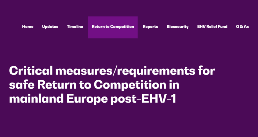 Depois de um período com eventos internacionais na Europa continental suspensos devido ao surto em curso da forma neurológica do herpes vírus equino (EHV-1), a Federação Equestre Internacional (FEI) divulgou documento contendo recomendações e melhores práticas para o retorno das competições. Há regras obrigatórias para serem seguidas incluindo medidas de segurança a serem tomadas antes de viajar, na chegada ao evento, durante a competição, procedimentos para caso um cavalo tenha de ir ao isolamento, além de indicações para saída do evento e retorno. A FEI também adicionou novos módulos ao FEI HorseApp para monitorar os principais requisitos obrigatórios nas medidas de retorno à competição.