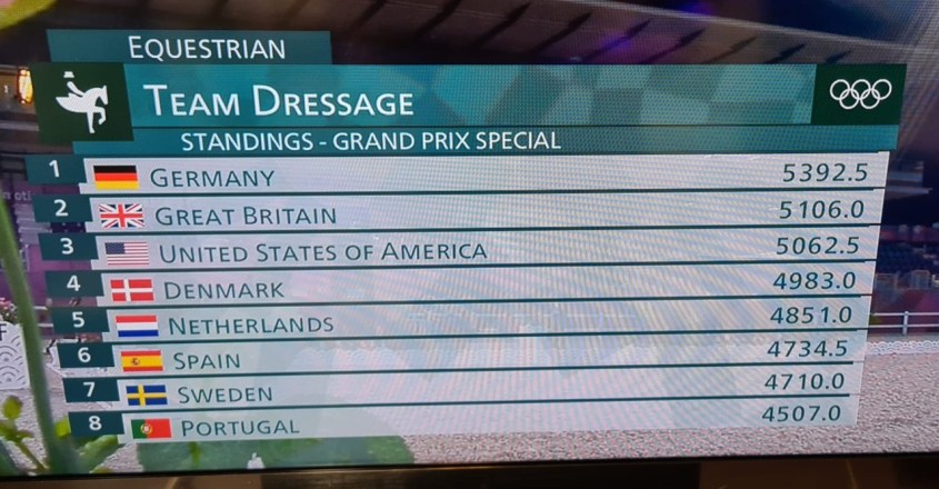 A rivalidade final pelo ouro que, até então, acreditava-se que ficaria nas selas de Charlotte Dujardin com Gio, pela Grã-Bretanha, e Jessica von Bredow-Werndl pela Alemanha com TSF Dalera não foi o que aconteceu. Em uma apresentação com erros caros, Dujardin pontuou menos que o esperado 2617 (79,544%) fazendo a Grã-Bretanha somar um total de 7.723, atrás, portanto, dos Estados Unidos com seus 7.747 pontos.