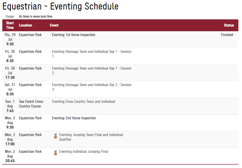 A inspeção veterinária do concurso completo foi na quinta-feira (29/7) às 9h30 do Japão (quarta, 21h30 de Brasília). As provas de adestramento estão divididas em três sessões: dia 30/7, 8h30 local (quinta, 20h30 de Brasília); 30/7, às 17h30 do Japão (5h30 de Brasília); e sábado (31/7), às 8h30 local (sexta, 20h30 de Brasília).