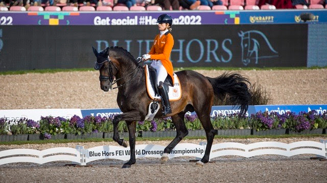 Com Dinja van Liere e Hermes (foto) obtendo a maior pontuação (78,835%) do primeiro dia de provas de grande prêmio no Campeonato Mundial de Adestramento da Federação Equestre Internacional, a Holanda saiu na frente e lidera a competição por equipes em Herning, na Dinamarca. Neste sábado (06/08), Nuno Chaves de Almeida foi o primeiro representante do Brasil a competir. Montando Feel Good VO, ele pontuou 62,904%.