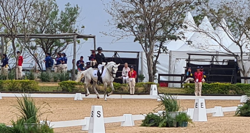 Primeiro brasileiro a competir na final individual do adestramento dos Jogos Sul-Americanos 2022, Murilo Augusto Machado abriu o segundo bloco de competidores na pista do Clube Hípico Paraguaio. Com o lusitano Jorge VO, o cavaleiro da Coudelaria Ilha Verde finalizou a reprise inter 1 estilo livre com 69,190%, tomando momentaneamente a liderança. Ao término de todos os concorrentes, Machado voltará para o Brasil com o 7º individual e uma medalha de ouro por equipe. “Foi uma experiência incrível — estar aqui e poder fazer isso é algo inexplicável”, disse em entrevista em vídeo.