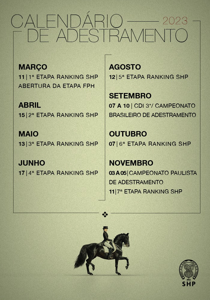 - 1ª etapa do Ranking de Adestramento da Sociedade Hípica Paulista => Programa original | Programa atualizado | Ordens de estrada – pista 1 e pista 2 | Resultados