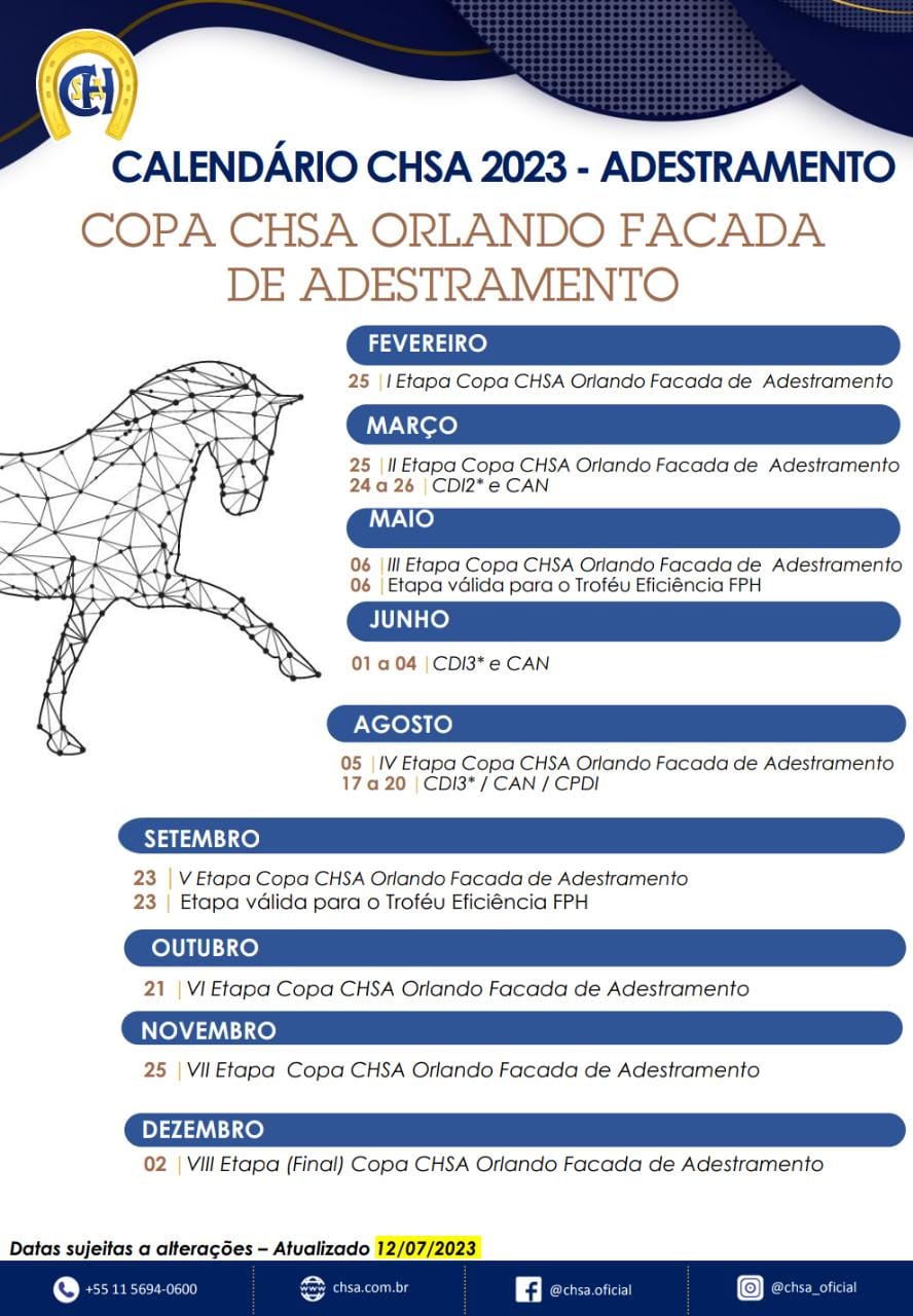 - Concurso de adestramento internacional (CDI 1* | CDI 2* | CDI 3*) => Página FEI | Programa – 03/04/23 | Programa -05/04 | Relação de participantes CDI | Ordens de entrada: 02/06 – 03/06 – 04/06 | Resultados: 02/06 small tour (PSJ) e big tour (GP) – 03/06 small tour (Inter 1) e big tour (GPS) – 04/06 small tour (inter 1 freestyle) e big tour (GP freestyle) | Gira