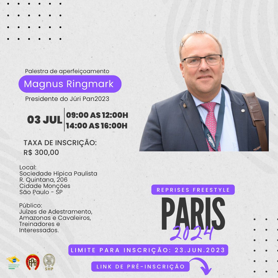 De 30 de junho a 2 de julho, o CDI ocorre na Sociedade Hípica Paulista junto com um internacional de paraequestre. E, no dia 3 de julho, haverá uma palestra de aperfeiçoamento com o juiz FEI sueco Magnus Ringmark, que preside o júri de adestramento no Pan 2023. Saiba mais aqui.