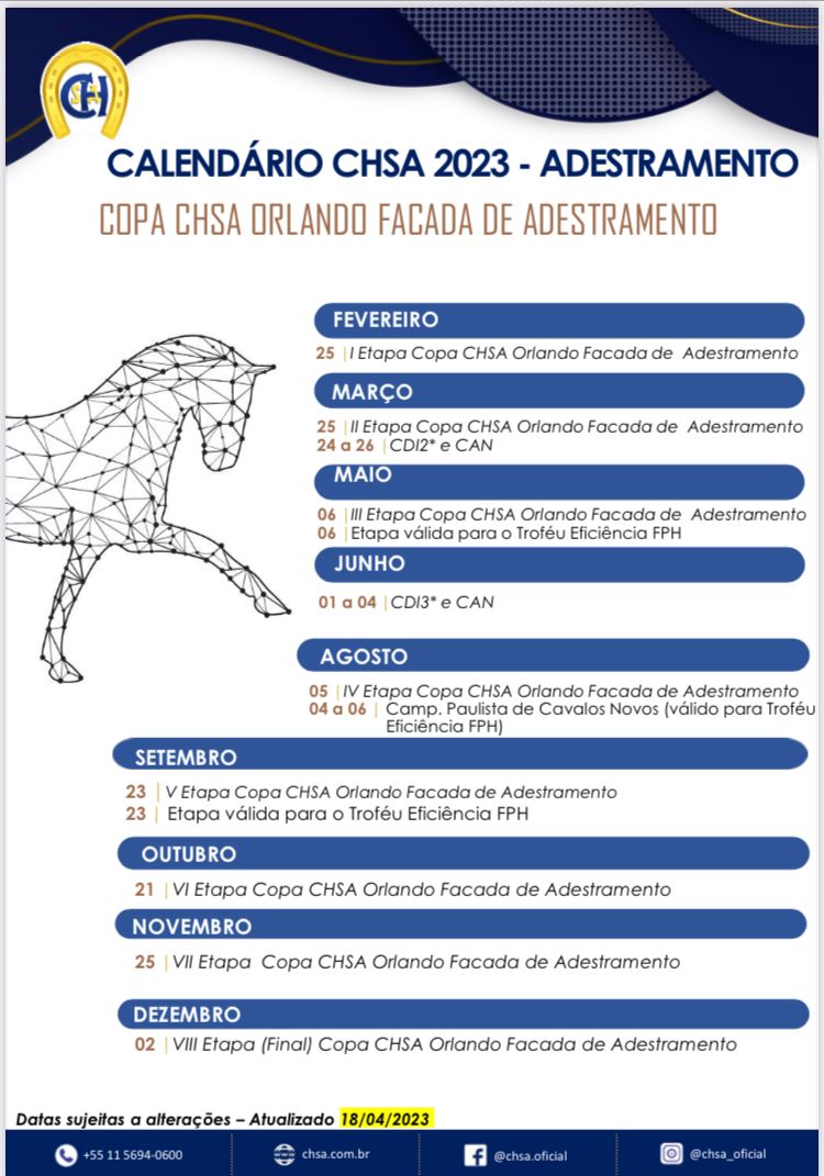 Até o momento, as séries elementar e preliminar são as mais disputadas. Com oito etapas previstas para 2023, a Copa CHSA Orlando Facada de Adestramento começou em fevereiro e segue até dezembro. Para seguir o ranking e disputar o título de campeão ou vice-campeão, o conjunto deve, obrigatoriamente, ter participado de, no mínimo, quatro etapas. Caso faça mais etapas, serão computados os quatro melhores resultados.
