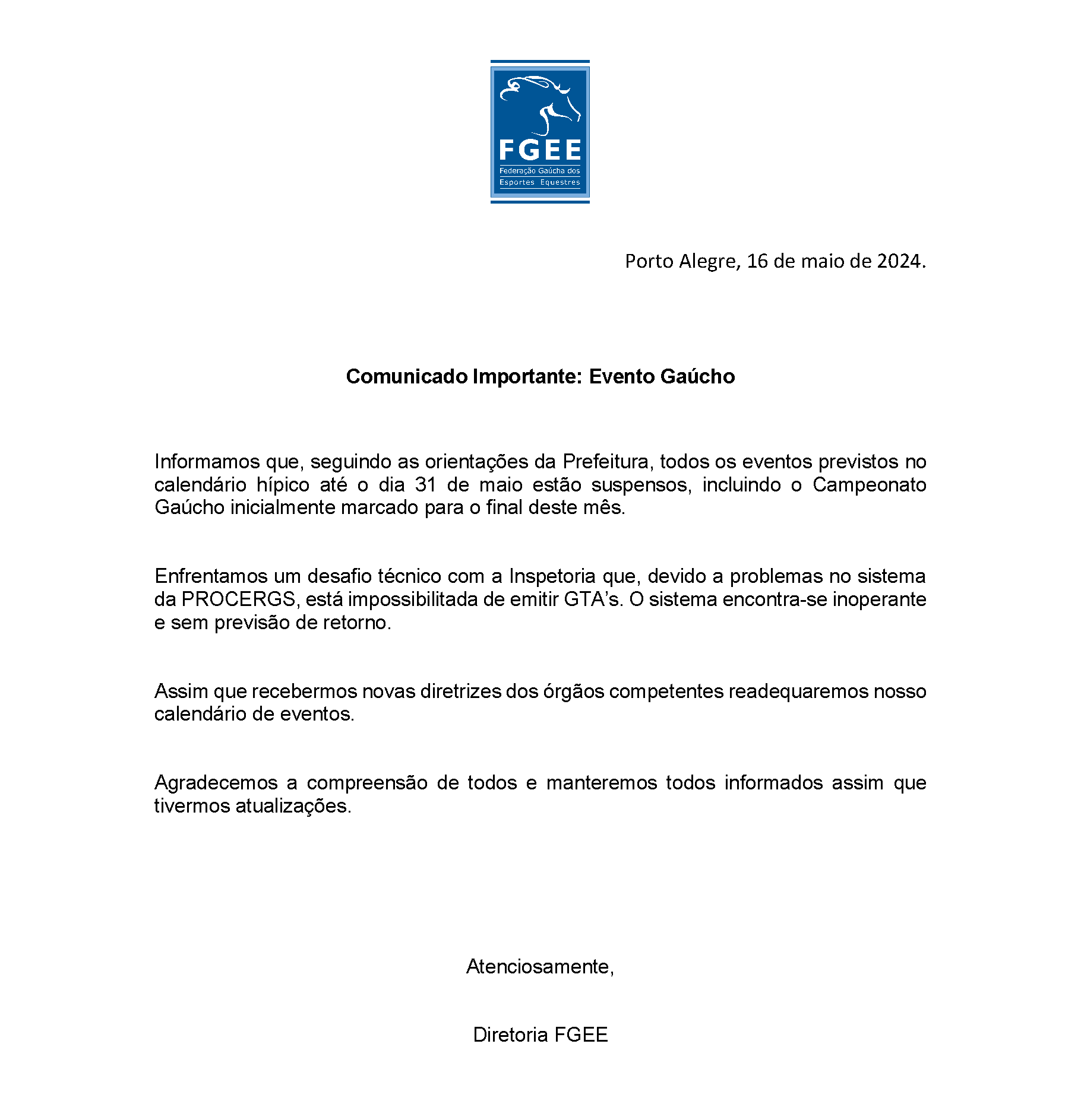 Por motivos óbvios, a Federação Gaúcha dos Esportes Equestres (FGEE) suspendeu os eventos equestres previstos no calendário de provas do Rio Grande do Sul pelo menos até 31 de maio. O Estado ainda lida com as consequências dos alagamentos, tem aeroporto internacional fechado e rodovias em colapso. Inclusive, não estão sendo emitidos GTA no Estado.