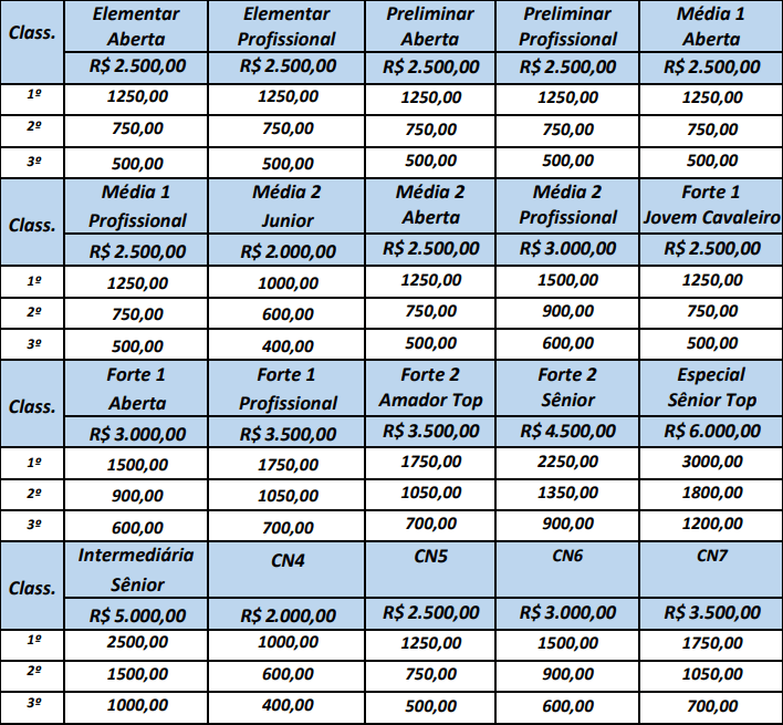 Além disso, minimirim e mirim terão premiação especial em brindes e/ou vales no total de R$ 2.500,00. Para o freestyle, haverá premiação especial para todos os participantes. E os tratadores recebem R$ 1.000,00 para cada um dos três cavalos mais bem-apresentados no concurso.