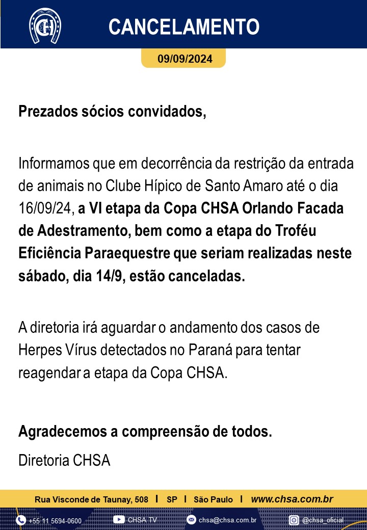 Assim, a 6ª etapa da Copa CHSA Orlando Facada de Adestramento e a 3ª etapa do Campeonato Inter-regional de paradestramento (válido para o troféu Eficiência), programadas para 14/9, foram canceladas. Em nota, o CHSA informou que vai aguardar o andamento dos casos de herpes-vírus para tentar reagendar as provas.