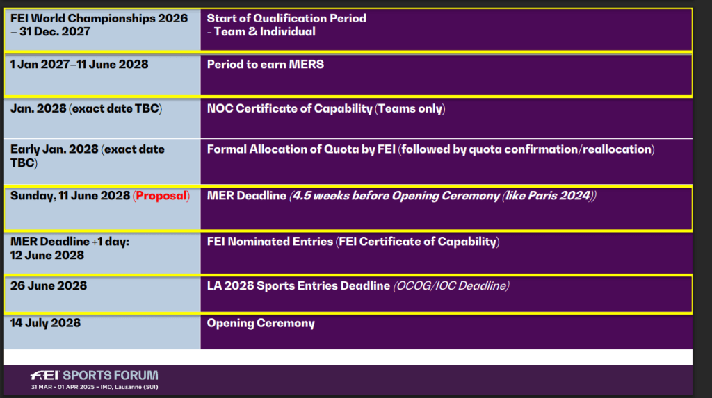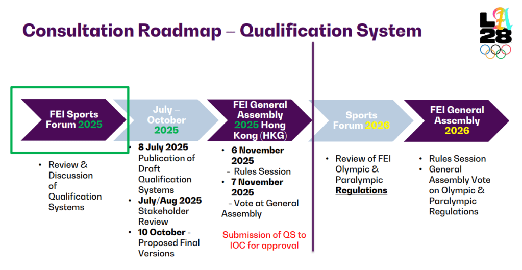Qualificação LA28 — O período de qualificação olímpica e paralímpica (equipe e individual) começará no Campeonato Mundial da FEI do ano que vem em Aachen, na Alemanha, e irá até 31 de dezembro de 2027. Potenciais conjuntos de cavalos e atletas olímpicos têm de 1º de janeiro de 2027 a 11 de junho de 2028 para obterem seus requisitos mínimos de elegibilidade (MERs) individuais. O período para obter MERs para os Jogos Paralímpicos vai de 1º de janeiro de 2026 a 11 de julho de 2028.