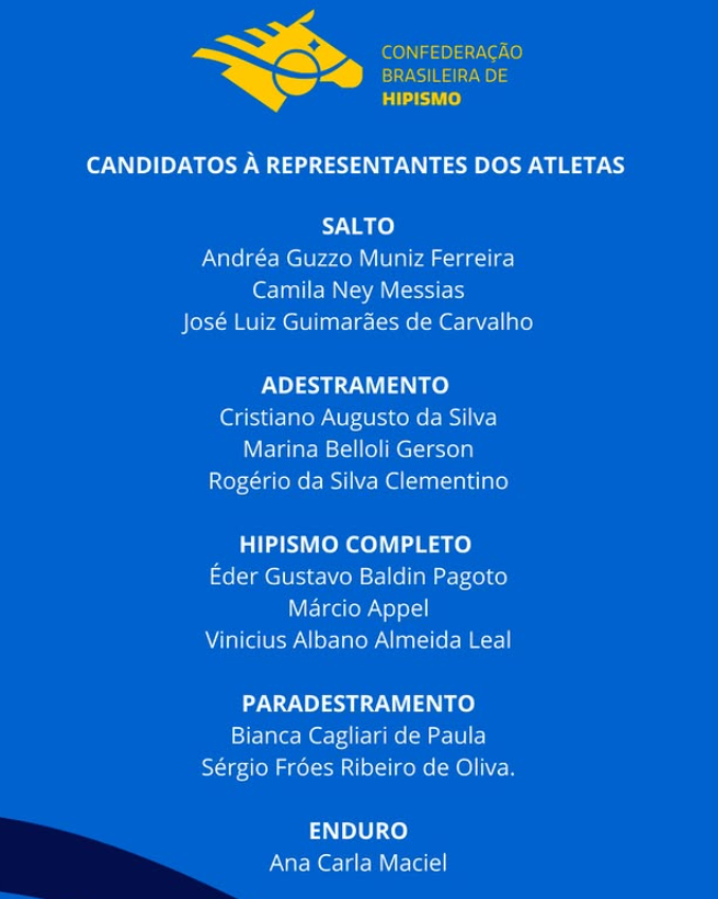 Podem ser eleitos no mínimo um e no máximo dois representantes de cada modalidade olímpica (salto, adestramento e concurso completo de equitação) e paralímpica (adestramento).