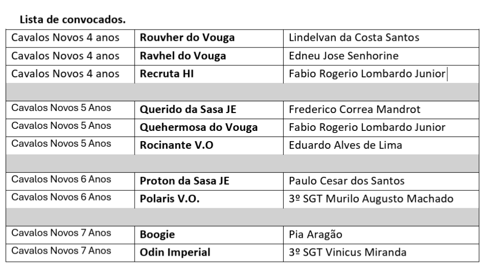 Para a primeira clínica, entraram animais classificados no Campeonato Brasileiro de Cavalos Novos 2025. Caso as vagas não sejam ocupadas em sua totalidade, serão chamados os conjuntos das diferentes idades com melhores porcentuais na somatória dos dois dias, de forma a possibilitar a participação do maior número de animais com o máximo de dez vagas por dia