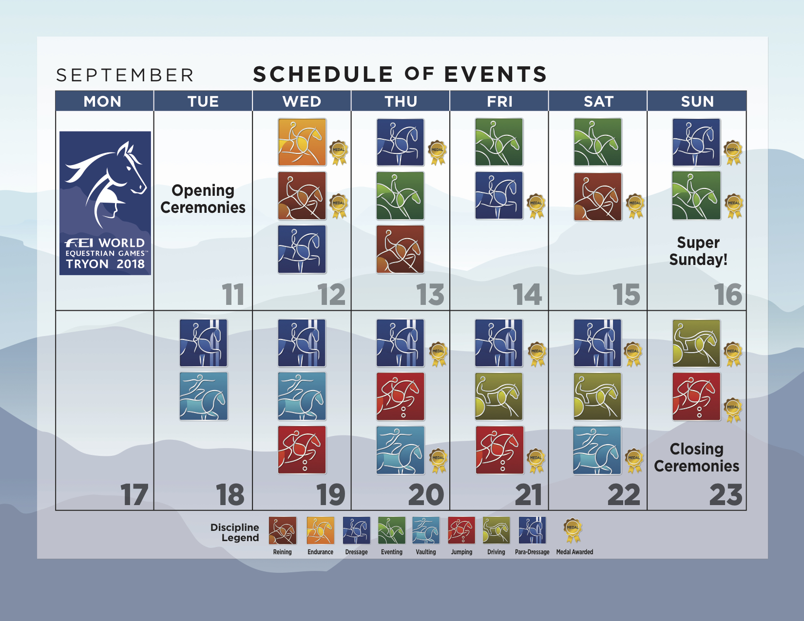 Os Jogos Equestres tiveram início em 1990 em Estocolmo, na Suécia. Desde então, é realizado a cada quatro anos, no intervalo do ciclo olímpico. A edição de 1994 foi em Haia, na Holanda; depois na Roma, Itália, em 1998; em Jerez, na Espanha, em 2002; em Aachen, na Alemanha, em 2006; em Kentucky, nos Estados Unidos, em 2010, e na Normandia, na França, em 2014. Neste ano, os Jogos ocorrem de 11 a 23 de setembro, no Tryon International Equestrian Center, na Carolina do Norte, nos Estados Unidos.