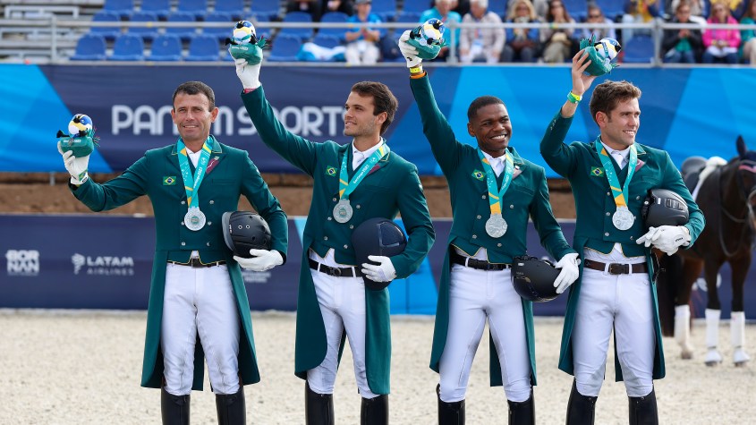 Brasil conquista prata inédita em Pan-Americano; saiba como foi — As cores das medalhas conquistadas pelo Brasil em Jogos Pan-Americanos mudaram. Depois de seis bronzes, sendo um único individual, a equipe formada por Paulo César dos Santos e Fidel da Sasa JE; Manuel Tavares de Almeida Neto e Rosa Belle; Renderson Oliveira e Fogoso Campline e João Victor Oliva e Feel Good VO, com Victor Ávila e Corsário IGS na reserva, conseguiram o feito inédito de subir no pódio em segundo lugar. E, com a medalha de prata no peito, puderam se emocionar e comemorar na Escola de Equitação do Regimento de Granadeiros, sede das competições equestres. E não tinha como ser diferente.