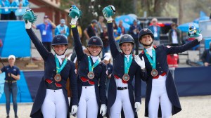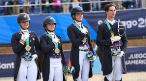 Time EUA é ouro com equipe jovem; assista à entrevista em vídeo — Medalha de ouro, a equipe dos Estados Unidos foi a mais jovem já enviada aos Jogos Pan-Americanos, conforme destacou Sarah Tubman na entrevista em vídeo na zona mista. Ela, medalha de ouro individual em Lima, é a veterana do time formado por Christian Simonson montando Son Of A Lady (único em small tour), Anna Marek com Fire Fly, Codi Harrison com Katholt’s Bossco e Tubman com First Apple, mesmo garanhão de Lima 2019.