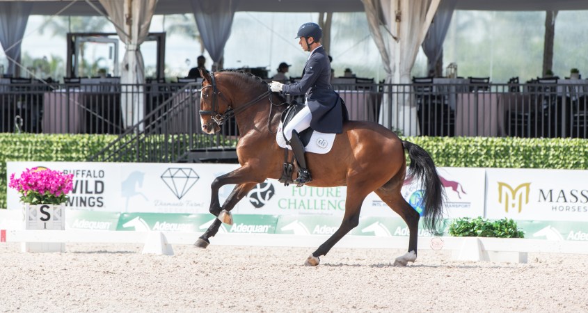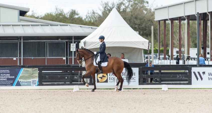 Em mais uma temporada de competições na Flórida, o cavaleiro português radicado dos Estados Unidos Tiago Ernesto avança o trabalho com lusitanos Interagro. Neste fim de semana, ele pontuou 71,063% na estreia de Hobbit Interagro no grande prêmio estilo livre com música e avançou com Hectar Interagro (foto que abre a matéria) em medium tour durante a décima semana do Global Dressage Festival (AGDF) em Wellington.