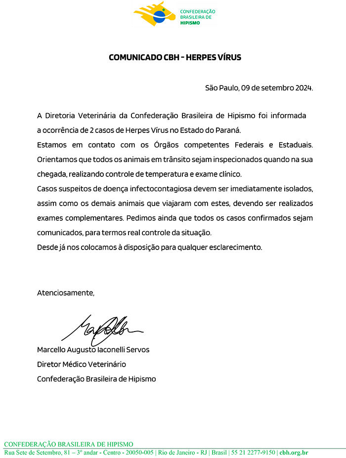 A forma neurológica do herpes-vírus equino (EHV-1) voltou a preocupar a comunidade equestre brasileira depois de duas éguas serem diagnosticadas com a doença. Adestramento Brasil entrevistou Alexandro Giordani, médico veterinário da Sociedade Hípica Paranaense, que identificou os casos e está à frente do tratamento. Tratam-se de duas éguas que participaram do CSI-W Longines São Paulo Horse Show, na Sociedade Hípica Paulista, entre 20 e 25 de agosto, e que, depois de retornarem à Sociedade Hípica Paranaense, apresentaram quadros da doença. Uma delas foi a óbito.